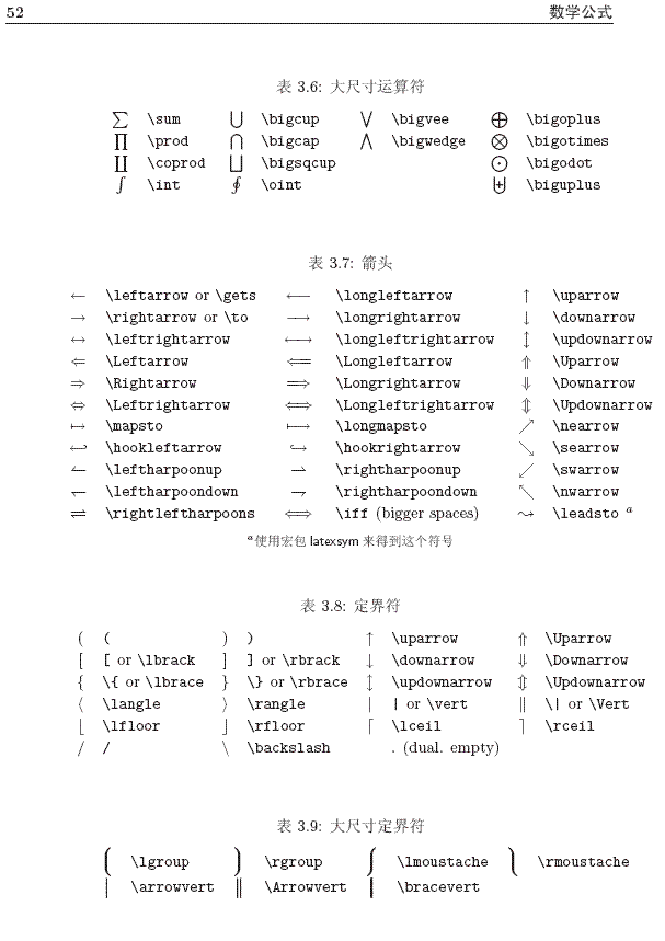 2、平方根(square root)的输入命令为:\sqrt,n 次方根相应地为: \sqrt[n]。方根符号的大小由LATEX自动加以调整。也可用\surd 仅给出符号。比如: 3、命令\overline 和\underline 在表达式的上、下方画出水平线。比如: 4、命令\overbrace 和\underbrace 在表达式的上、下方给出一水平的大括号。 5、向量(Vectors)通常用上方有小箭头(arrow symbols)的变量表示。这可由\vec 得到。另两个命令\overrightarrow 和\overleftarrow在定义从A 到B 的向量时非常有用。 6、分数(fraction)使用\frac{...}{...} 排版。一般来说,1/2 这种形式更受欢迎,因为对于少量的分式,它看起来更好些。 7、积分运算符(integral operator)用\int 来生成。求和运算符(sum operator)由\sum 生成。乘积运算符(product operator)由\prod 生成。上限和下限用^ 和_来生成,类似于上标和下标。 以下提供一些常用符号的表示方法 |